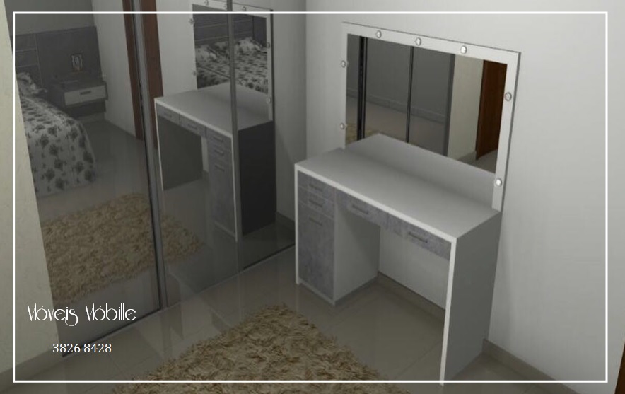 Projeto: Penteadeira camarim, com moldura para espelho em MDF branco com frentes de gaveta em MDF Mood, Linha essencial - duratex. O projeto 3d permite ao cliente uma perfeita representação do trabalho.